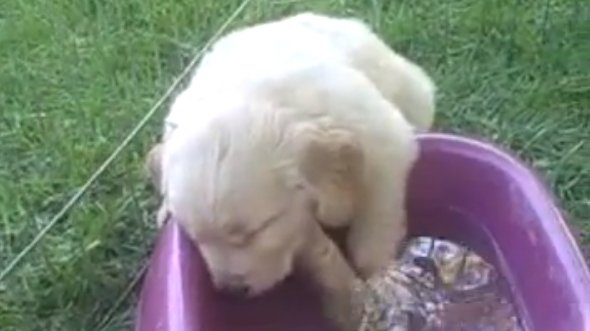 水の入ったボウルの中で遊んでいた生後6週間のゴールデン・レトリーバーの子犬が、突然、睡魔に襲われてしまったようです。溺れないか心配になるペットムービーをご覧ください。