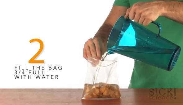 コーンフレークから鉄分を取り出す方法は、まずビニール袋に水とコーンフレークを入れます。次に、1時間ほど放置してドロドロの液体にします。そして最後に磁石を当てて、15秒~20秒ほどかき混ぜると、鉄分だけが磁石に吸い寄せられて取り出すことができます。